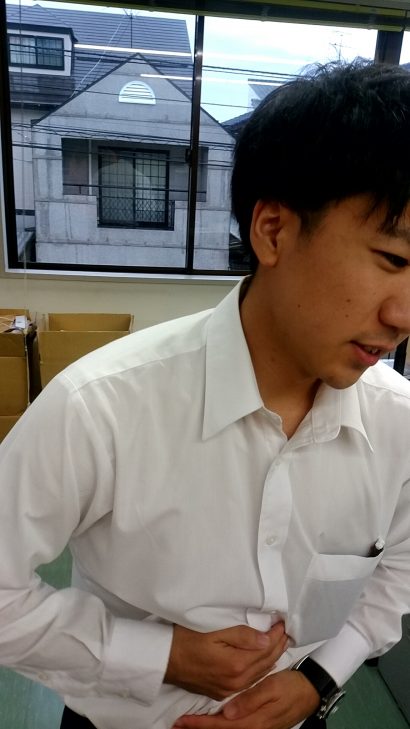 お腹を押さえて、左右に揺れていたせいです。