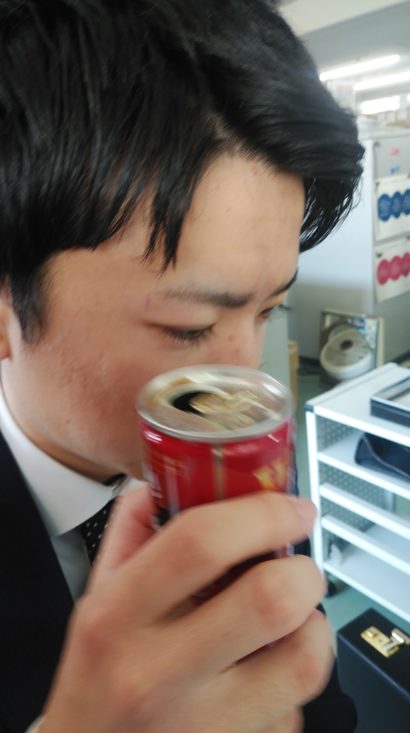 缶コーヒーで顔を隠す・・・斬新すぎる。