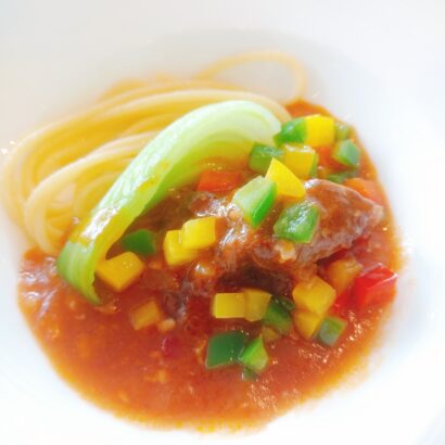 黒毛和牛ほほ肉のピリ辛トマト煮込みパスタ添え
