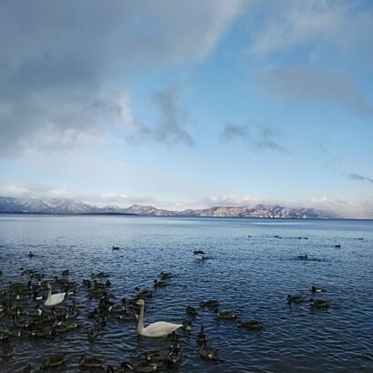 夕暮れの湖畔で泳ぐ白鳥たちはとても優雅でした。