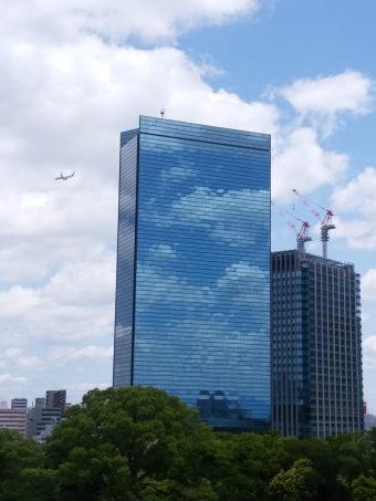 高層ビルに青空が映って綺麗だった上に、