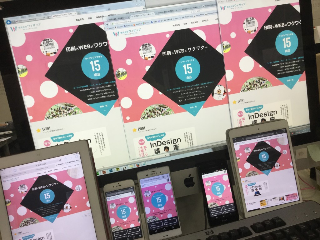 色々な機種やブラウザで確認しないといけないので、公開直前は机の上がこんな状態になります↓
