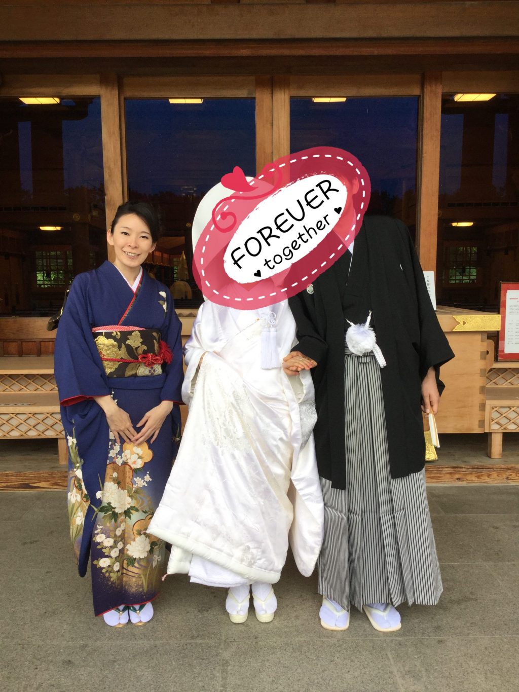 ちゃっかり商品の紹介が入ってしまいましたが、親族ながら素晴らしい結婚式となりました。今回は神前式だったので御社殿の前で3人で。