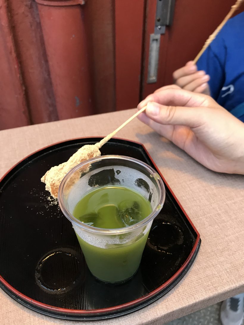 画像は、浅草きびだんご あづま さんのきびだんごと冷し抹茶ですが、この組み合わせが最高に美味しかったです。