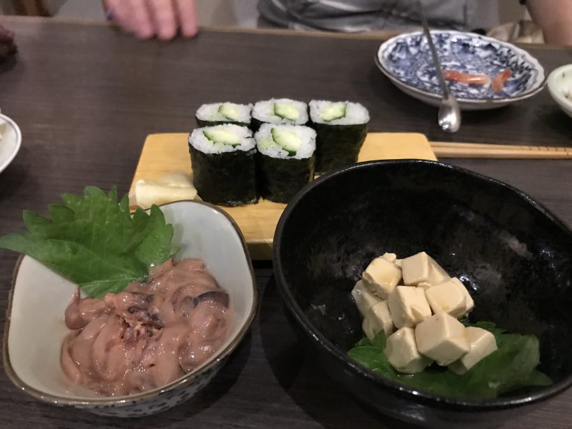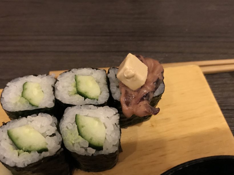 そして、友人オススメの河童巻きにイカの塩辛とチーズの醤油漬けを乗せて食べる食べ方。