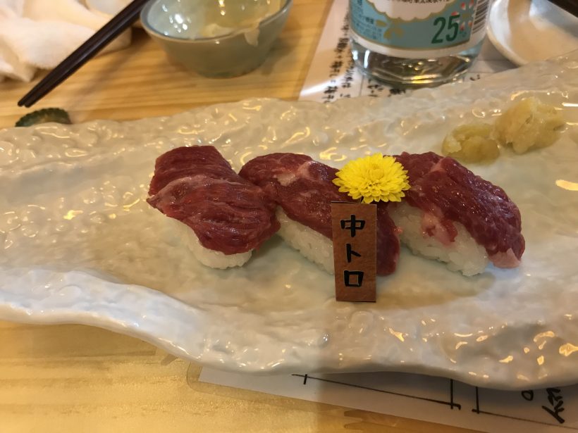 画像は、馬肉のお寿司ですが、新鮮で脂もあり、とても美味しかったです。