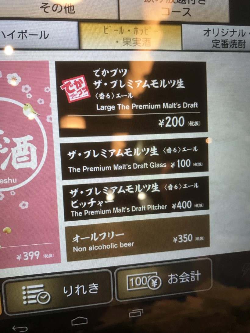 なるほど、お店の注文パッドもビールの表記が100円になってました。
