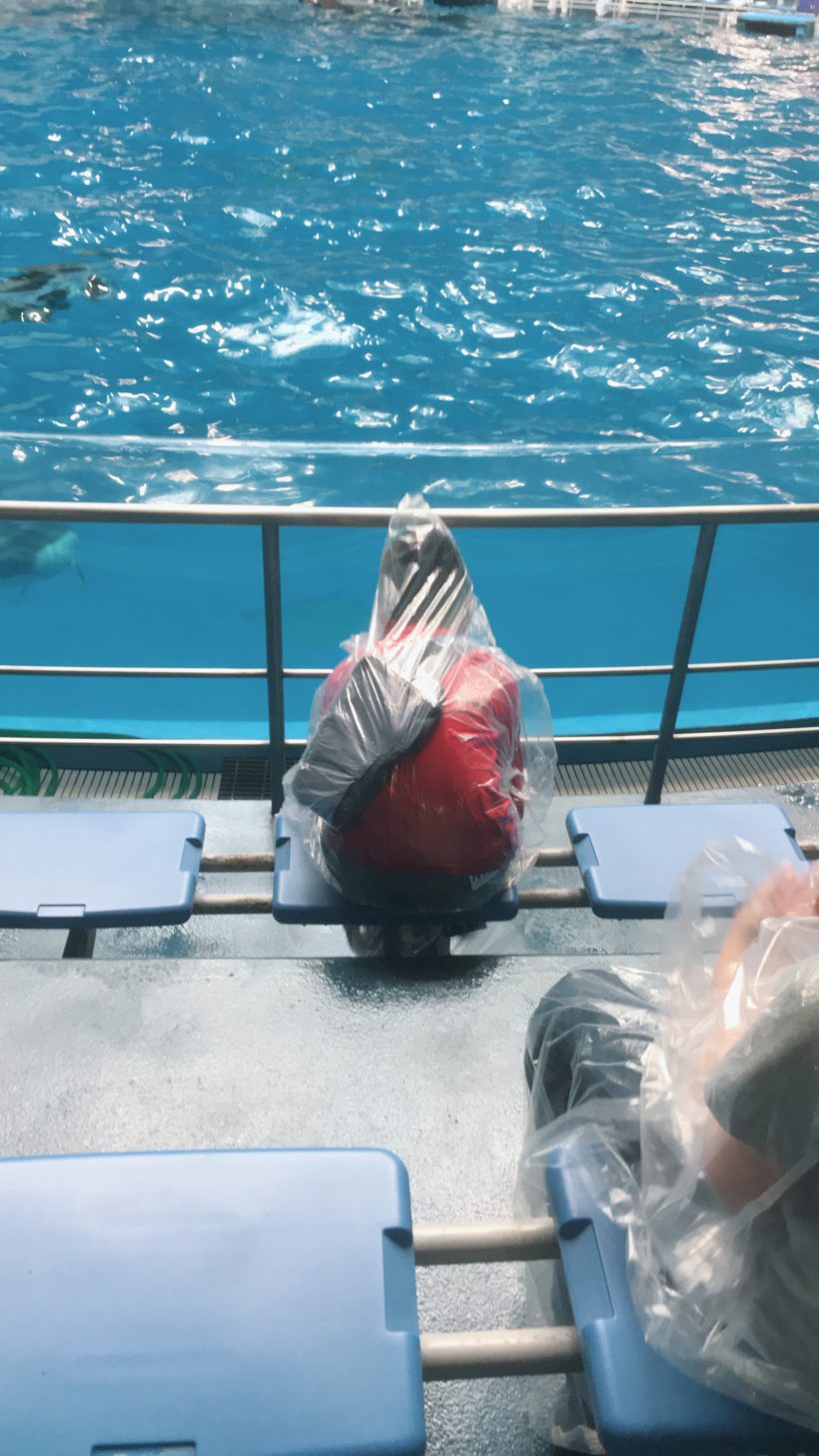 息子は、最前列で水にかけられる気マンマンで楽しんでました。