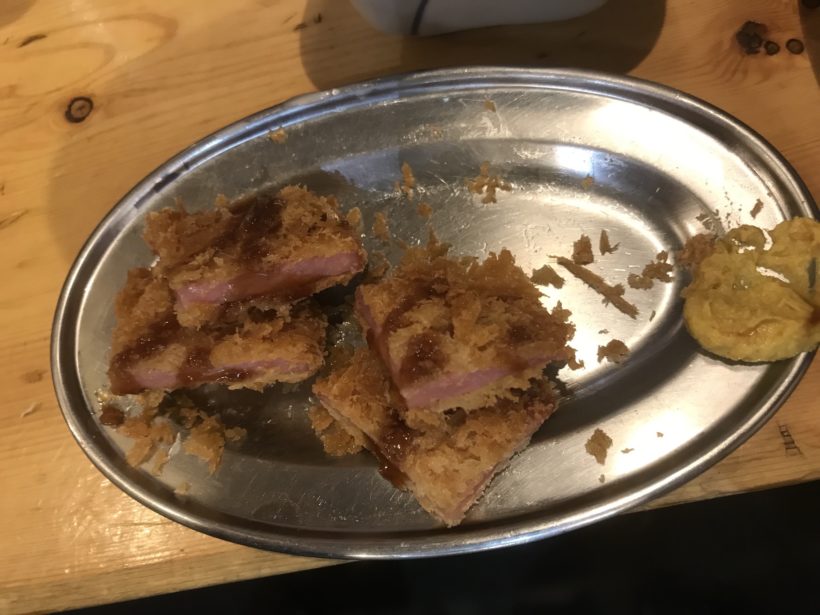キャベツに、マカロニサラダに、ハムカツに、チキンカツに、通常の2杯分くらいあるメガハイボールを頼んで、2人で2千円。