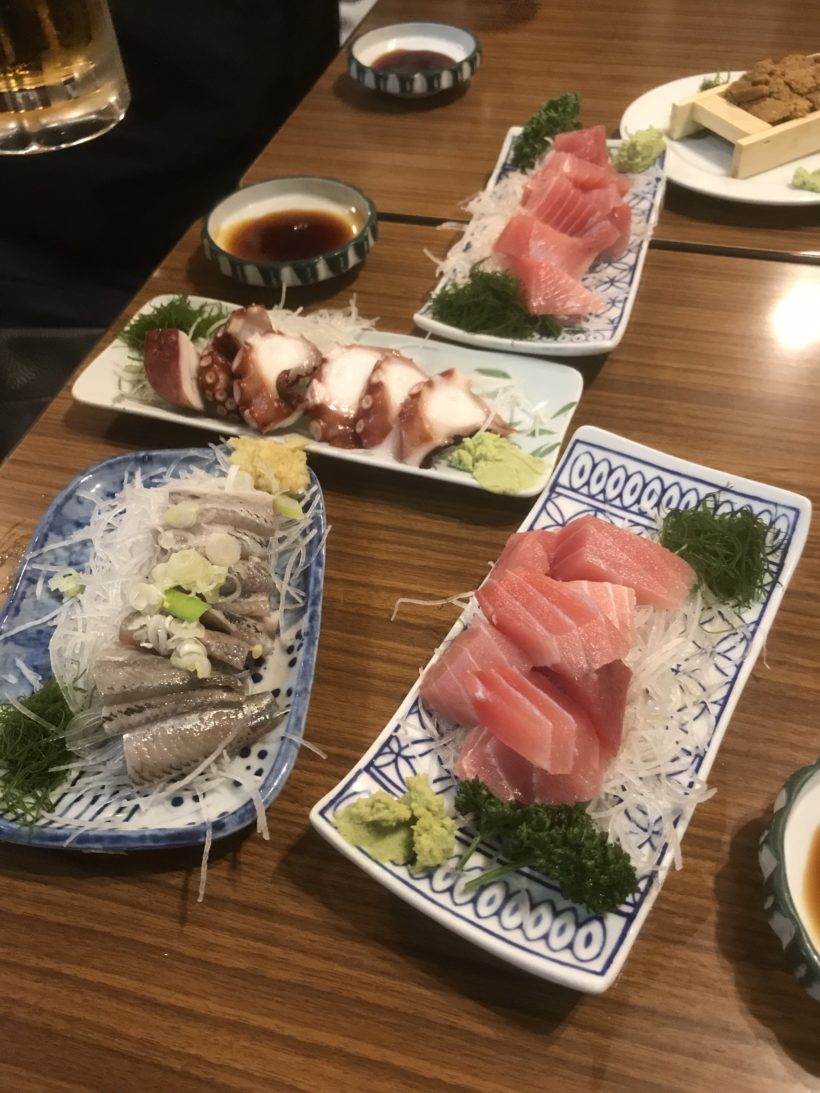 それぞれが好きな魚を注文すると、お刺身バイキングのように、テーブルの上に色々な魚の皿がのって、贅沢な、壮観なながめでした。