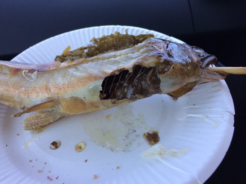 いつも釣り堀で釣って食べる魚の塩焼きとは、やっぱり炭が違うみたいで、「皮が固い」と言ってお口に会わなかったようです。