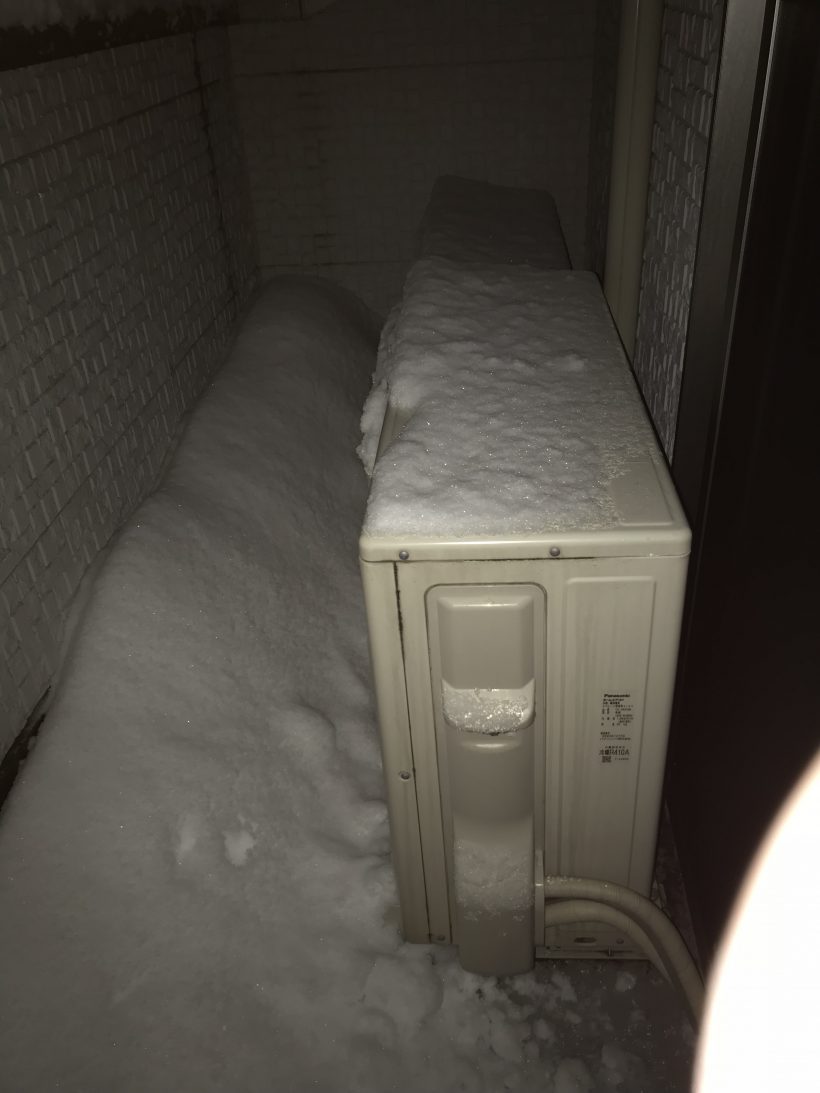 エアコンって外の暖かい空気を吸って、冷たい空気を吐き出して室内を温めている為、室外機の空気の出入り口を雪が塞いでいると上手く機能しないようです。