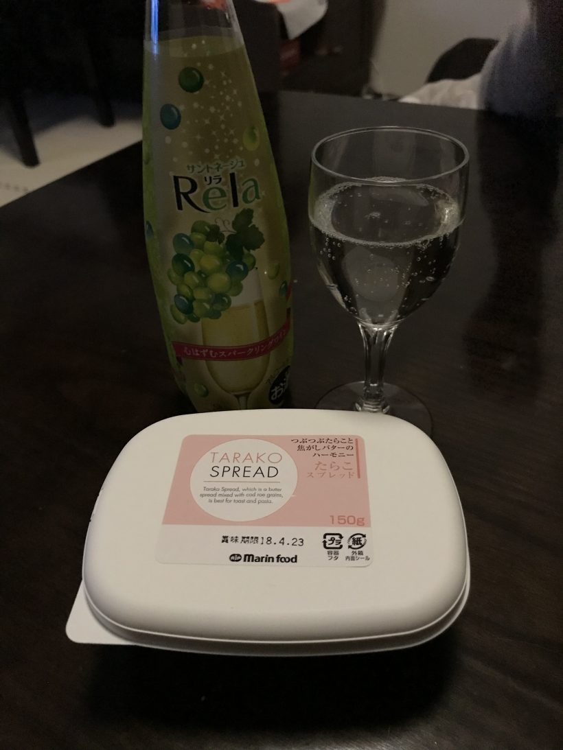 スパークリングワインとタラコバターをクラッカーに塗った物をつまみに乾杯してました。