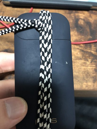 写真を見てもらえば分かると思いますが、アイコスのホルダーのフックが折れたのか閉まらなくなりヘアゴムを代用して無理くり止めているような感じになってますf^_^;)