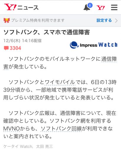 スマホが復旧した時にYahoo!ニュース見ていたらソフトバンクで謎の通信障害による報告が相次いでいるようです。