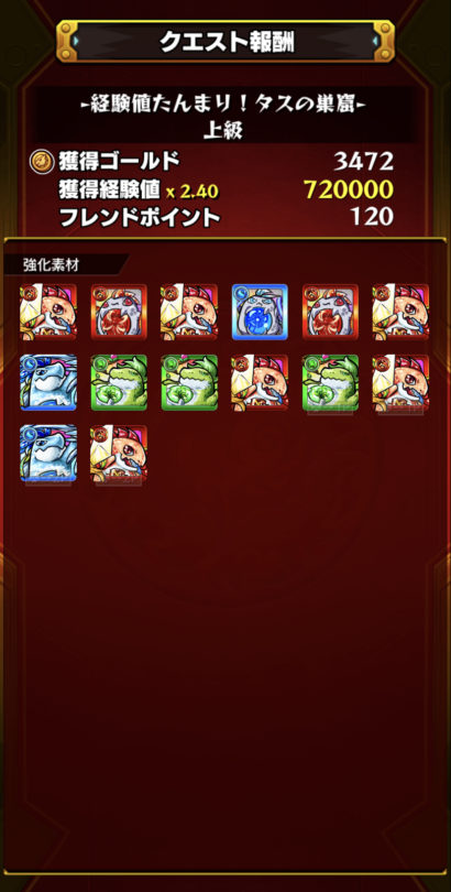 本来であれば経験値倍の日のノマダンを周回するのが基本なんですが、ふと自分が持っているチケットを確認した時に「経験値たんまり!タスの巣窟」数枚あったので、これを有効活用して一気にレベルを上げました!