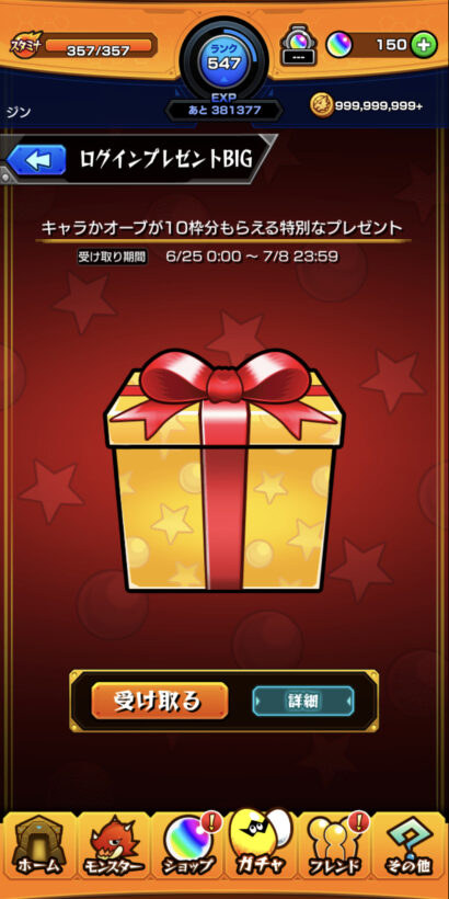 情報確認していなかったので、最初は何だこれ?と思いましたが、キャラかオーブを10枠分もらえる有難いプレゼント🎁