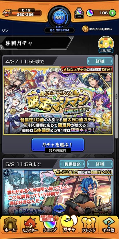 属性ガチャが選択出来るシステムな上に5属性全て回して最後に選んだ属性では限定が1体確定な熱いガチャ!