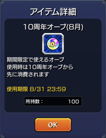 8月.9月.10月と各月で100個オーブを貰えるのですが、その月の内に使わないとオーブが消滅してしまう点だけは気をつけなければいけません💦