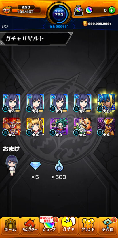 そんなコラボですが、記念と言う事で10連回しましたが、あんまりパッとしない結果だった事は覚えています。
