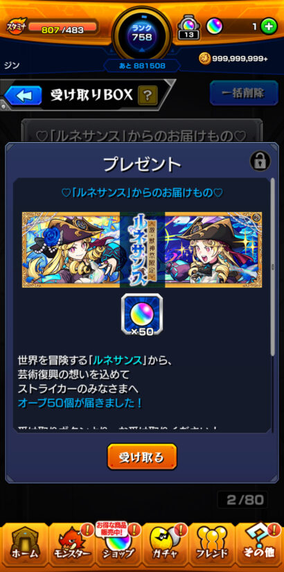 さて、そんな今日は開催中の激・獣神祭より新限定「ルネサンス」の実装を祝してオーブが配布されました!