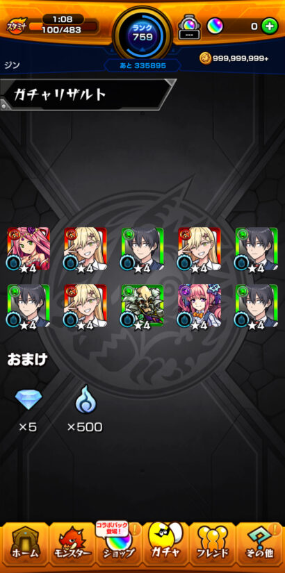今回のコラボのガチャに関しては初見の10連でノノアを2体ゲット出来ただけで、その後もそこそこ回していますが、それ以降はコラボキャラは出ていません…(T . T)