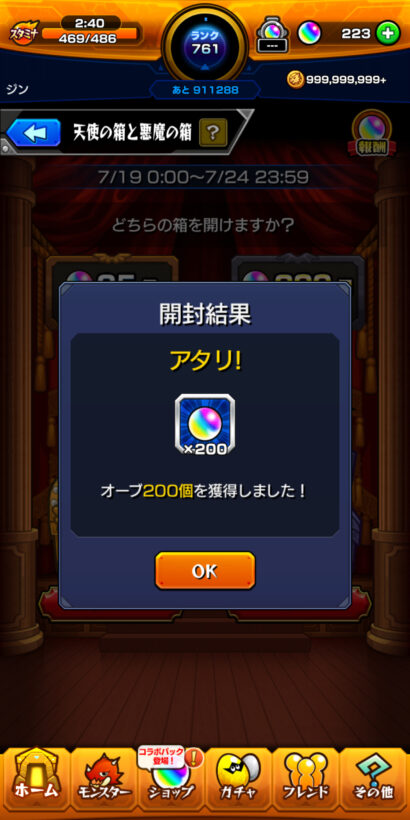 悪魔の箱を選択して外れた場合は天使の箱にオーブ+5個が加算されます。