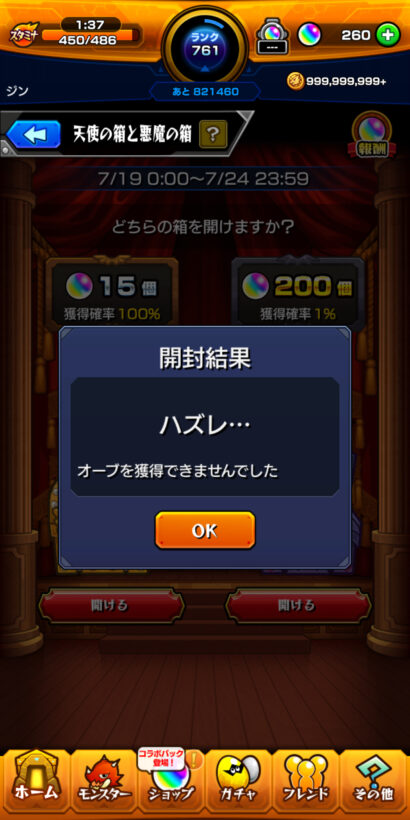 何故なら今日が最終日なので、今日悪魔の箱を選んで外れた場合は0個でオーブ回収ならずで終わってしまいます。