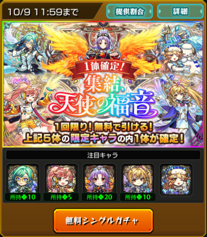 獣神化・改が発表された5体の天使の中から確定で1体手に入れる事が出来る無料ガチャ✨