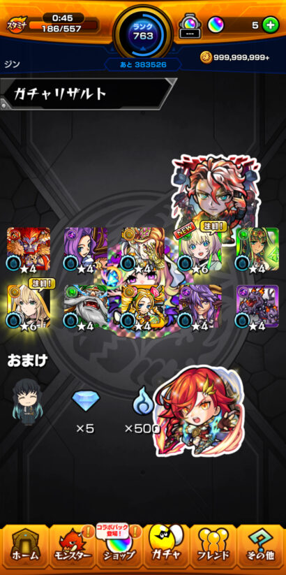 コラボ期間はまだ少しあるので、またチャンスがあればガチャろうとは思いますが、かき集めた分は使い切ってしまったので、今回の10連で試合終了かな…。