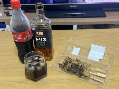 ちょっと前に実家に行ってウイスキーを貰ったので、スーパーでつまみとして焼き鳥を買ってコーラハイボールが好きなので、一緒にコーラも購入!