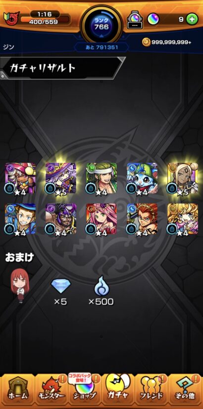 今のところ、何度がガチャを引いていますが、コラボキャラは0体。