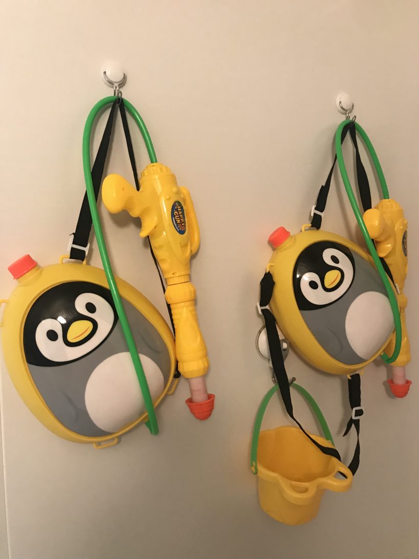 夏だし濡れても平気なことから、この水鉄砲を3個も買いました。ペンギンとニコニコマークの2種類ありました。