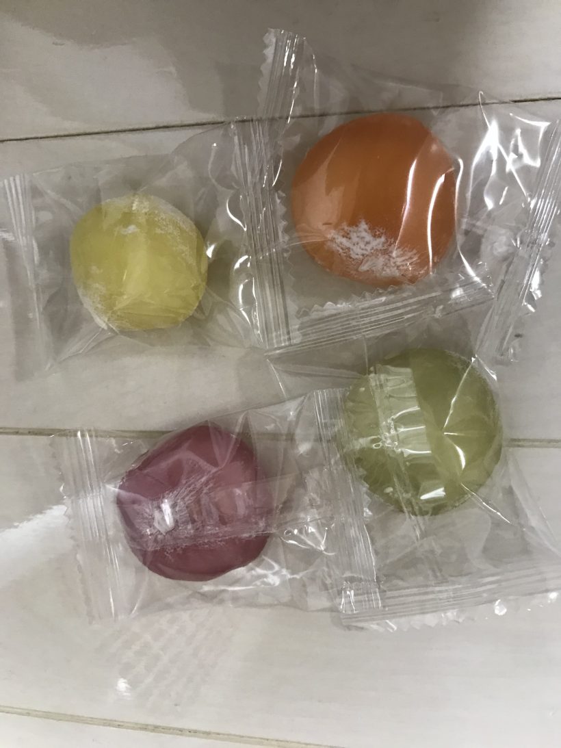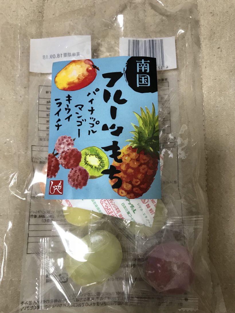 パイナップル、マンゴー、キウイ、ライチの4種の味で、もちとマシュマロの中間のような食感で美味しかったです。