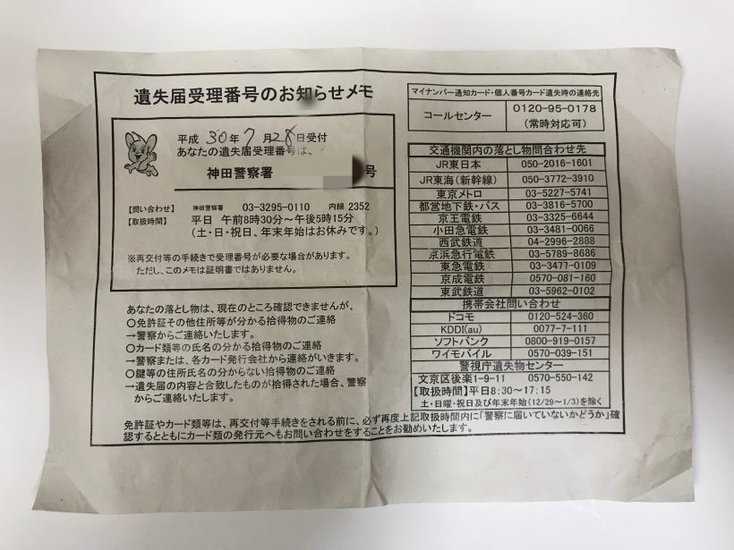 子供もいたので、夕飯は食べさせて、私はまず交番に向かい紛失届けを出しました。