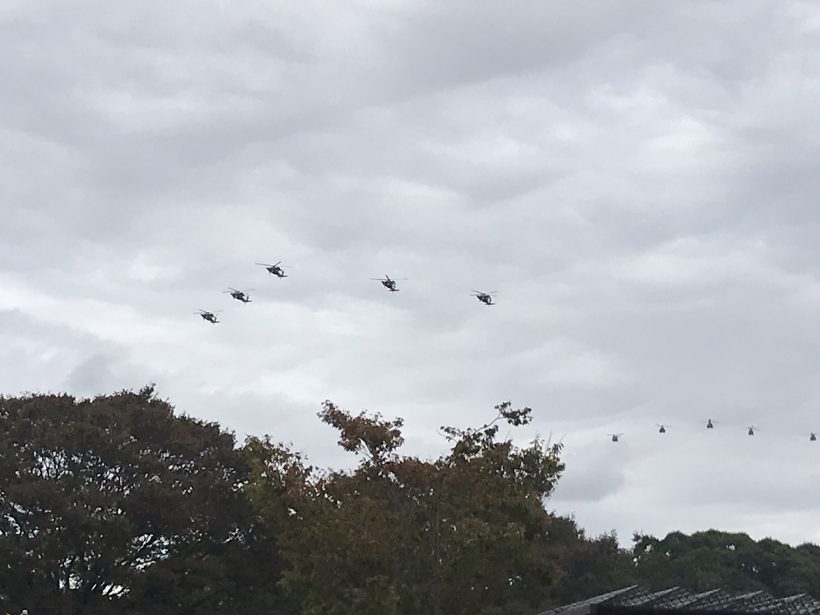 上空には自衛隊の飛行機やヘリコプターがたくさん飛んでいました。きっと朝霞駐屯地か横田基地に向かって飛んで行ったのかなぁ。