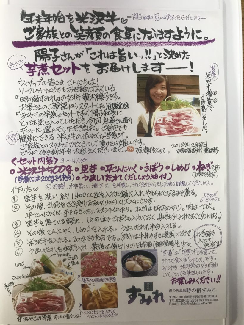 湯ノ沢温泉「時の宿すみれ」の女将さん、黄木綾子さんのお手紙&詳しいレシピを見て嫁が芋煮を作ってくれました。
