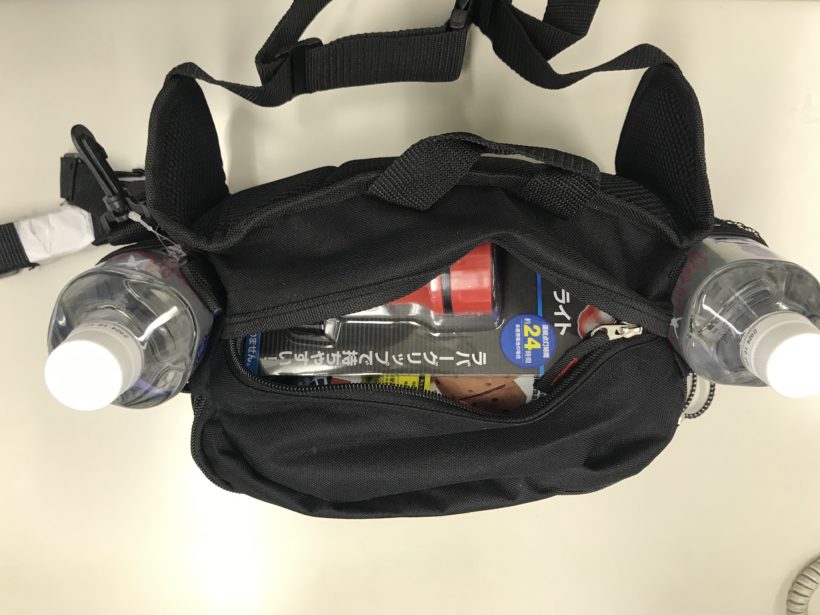 ライトやラジオ、保存水、栄養補給食品、緊急トイレ、雨具や軍手にホイッスル、携帯充電器、ウェットティッシュ、コンパス、簡易寝袋など揃ってます。