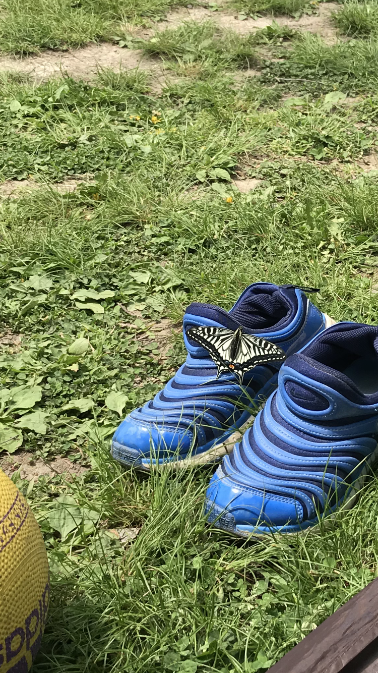 モンシロチョウが子供の靴にとまりました。