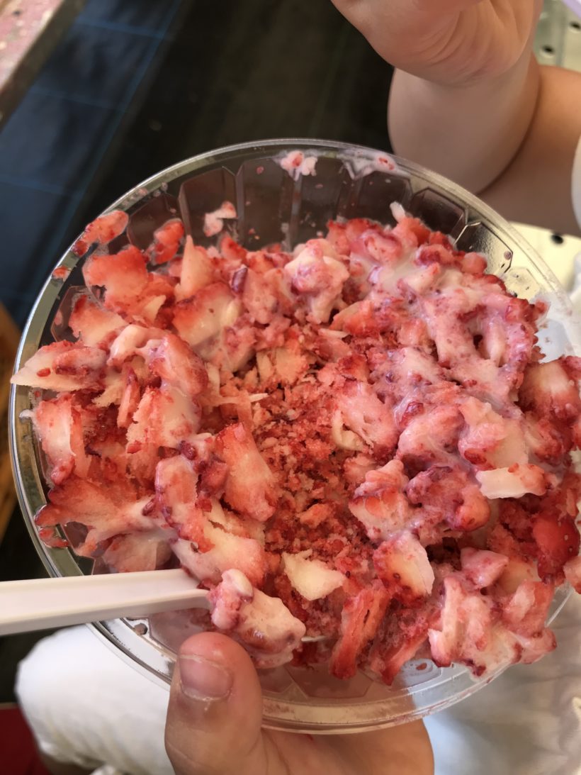 近くにはいちご狩りのできるいちご農園があり、ここの模擬店にもいちごのかき氷を出店していて、いちごの果肉たっぷりのかき氷がおすすめです。