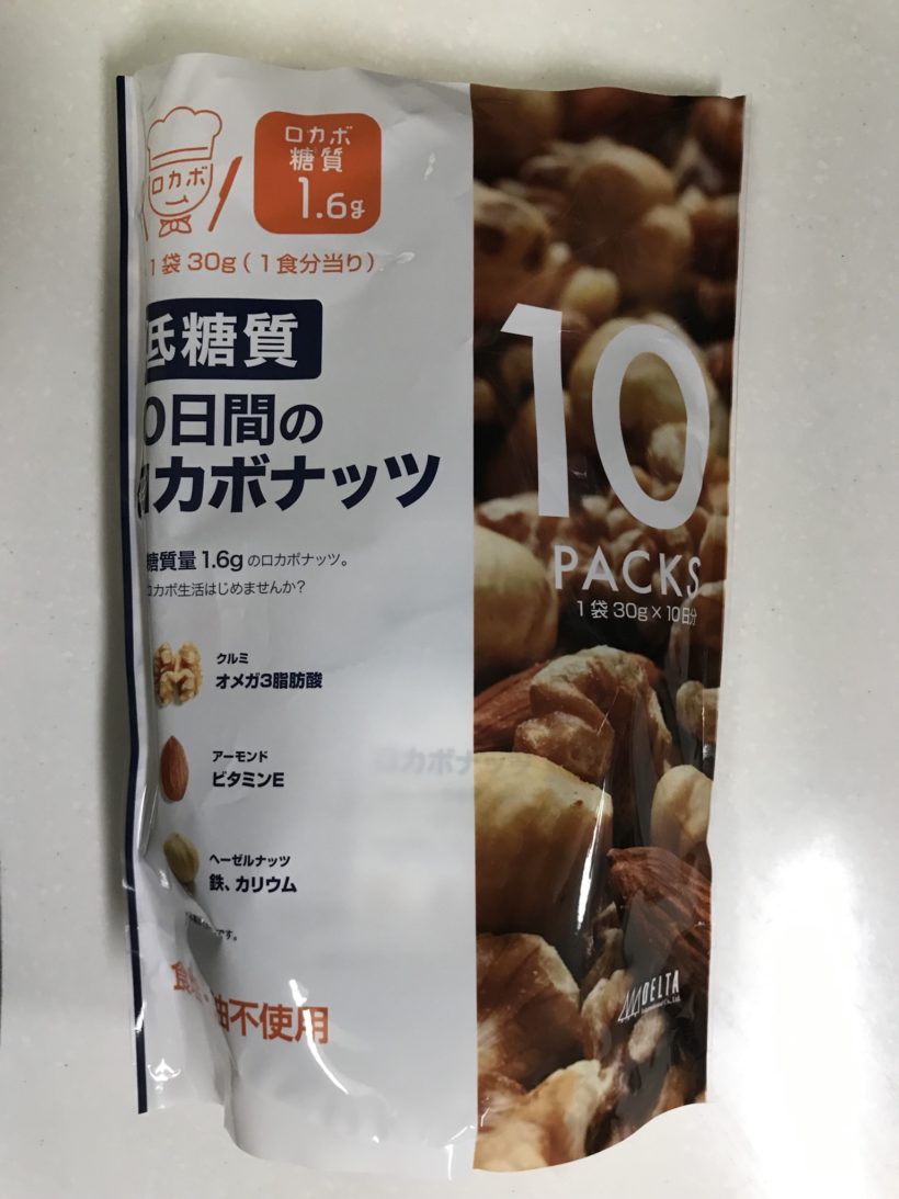 ロカボとは低糖質食のことを指します。良質な脂質はたくさん摂取し、糖質を適正に摂取できる商品です。ロカボナッツは、クルミとアーモンドとヘーゼルナッツの3種類が入っていて、300g(30g×10袋)で928円(税込)でした。