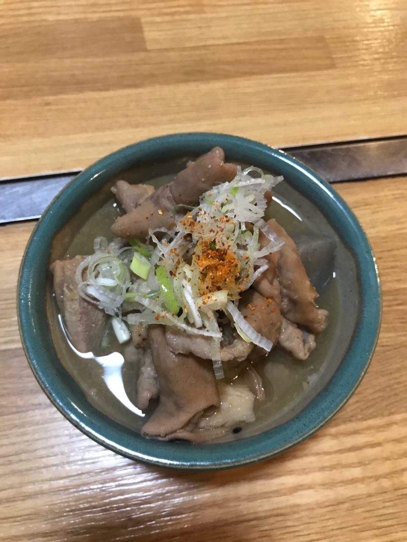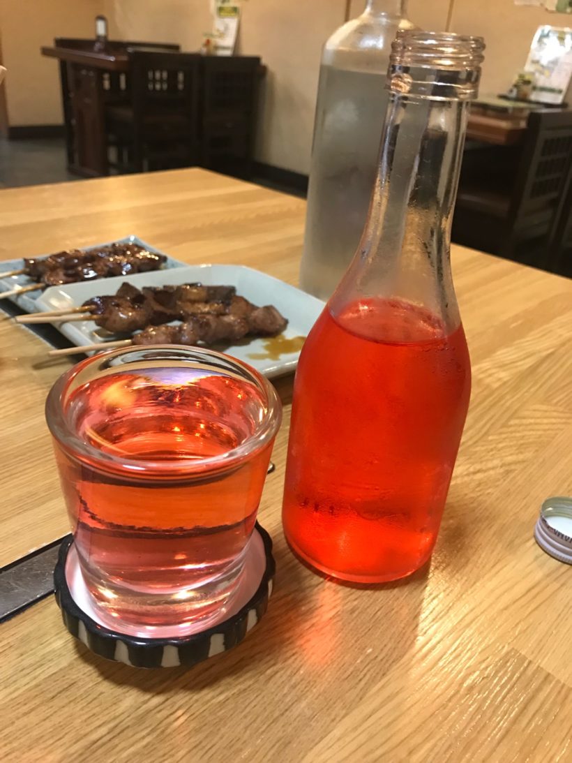 あとは私が大好きな居酒屋さんのもつ煮と赤い酒。まずもつ煮は味が染みていて、みそベースの絶妙なスープに具も好きなものがすべて入っています。赤い酒はほんのり梅の香りがするもので焼酎を割って飲みます。