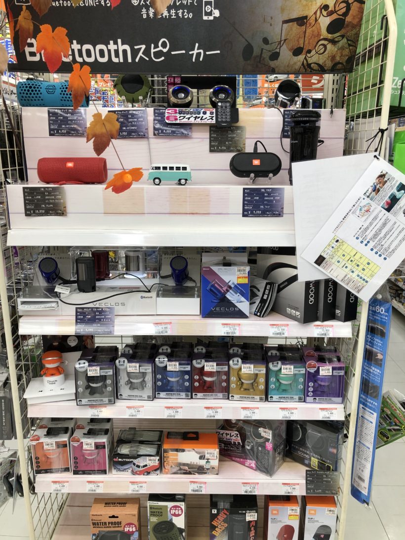 今回掃除品以外に店内の商品を見ていて、欲しいなと思ったのが、Bluetoothスピーカー。可愛らしい、オシャレな車や人形のマスコット型スピーカーがたくさんありましたよ。