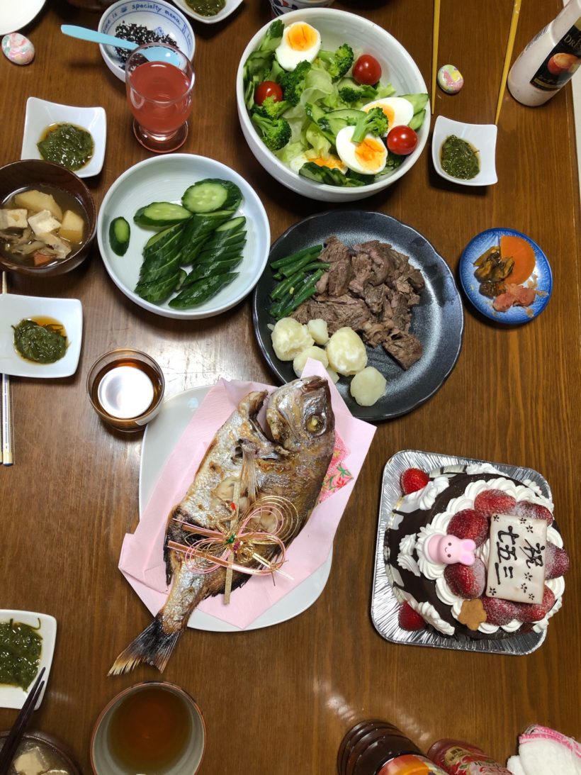昼は鯛やケーキ、好きな日帰り温泉に行き、夜はお寿司でお祝いしてくれました。