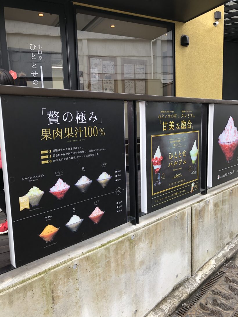 帰り際に子供はかき氷専門店の「小田原ひととせの雪」に立ち寄り限定のシャインマスカットのかき氷といちごのかき氷を買って車のなかで食べてました。