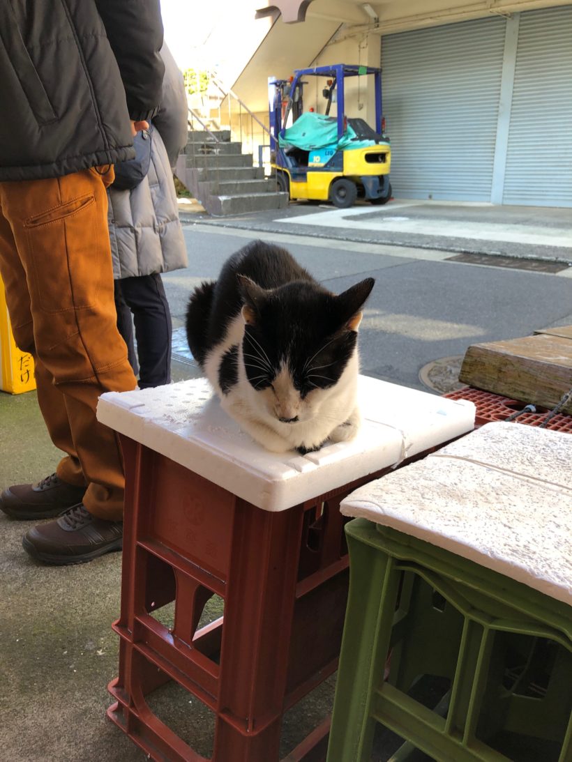 どこに入るか迷った挙句、「ぎょぎょ魚の三太郎」というお店に入りました。店の前には猫ちゃんがいました。