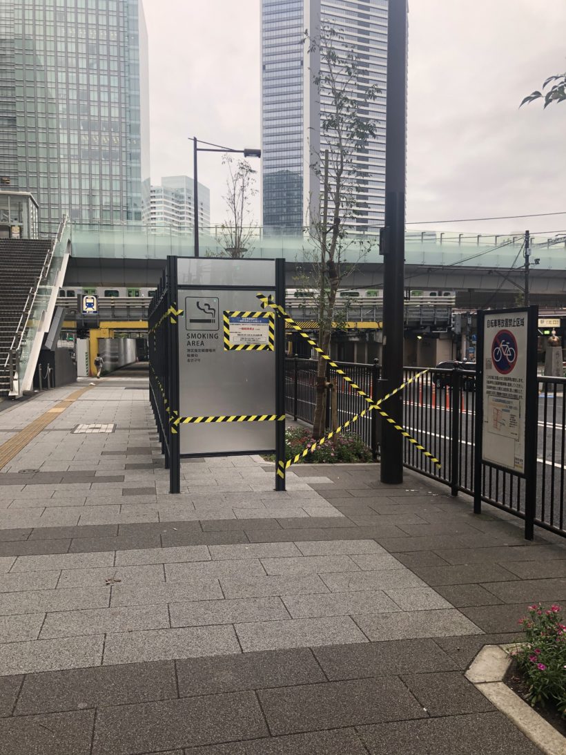 オフィス街はサラリーマンも少なく感じます。いつもは人混みの喫煙スペースも立ち入り禁止になっていました。
