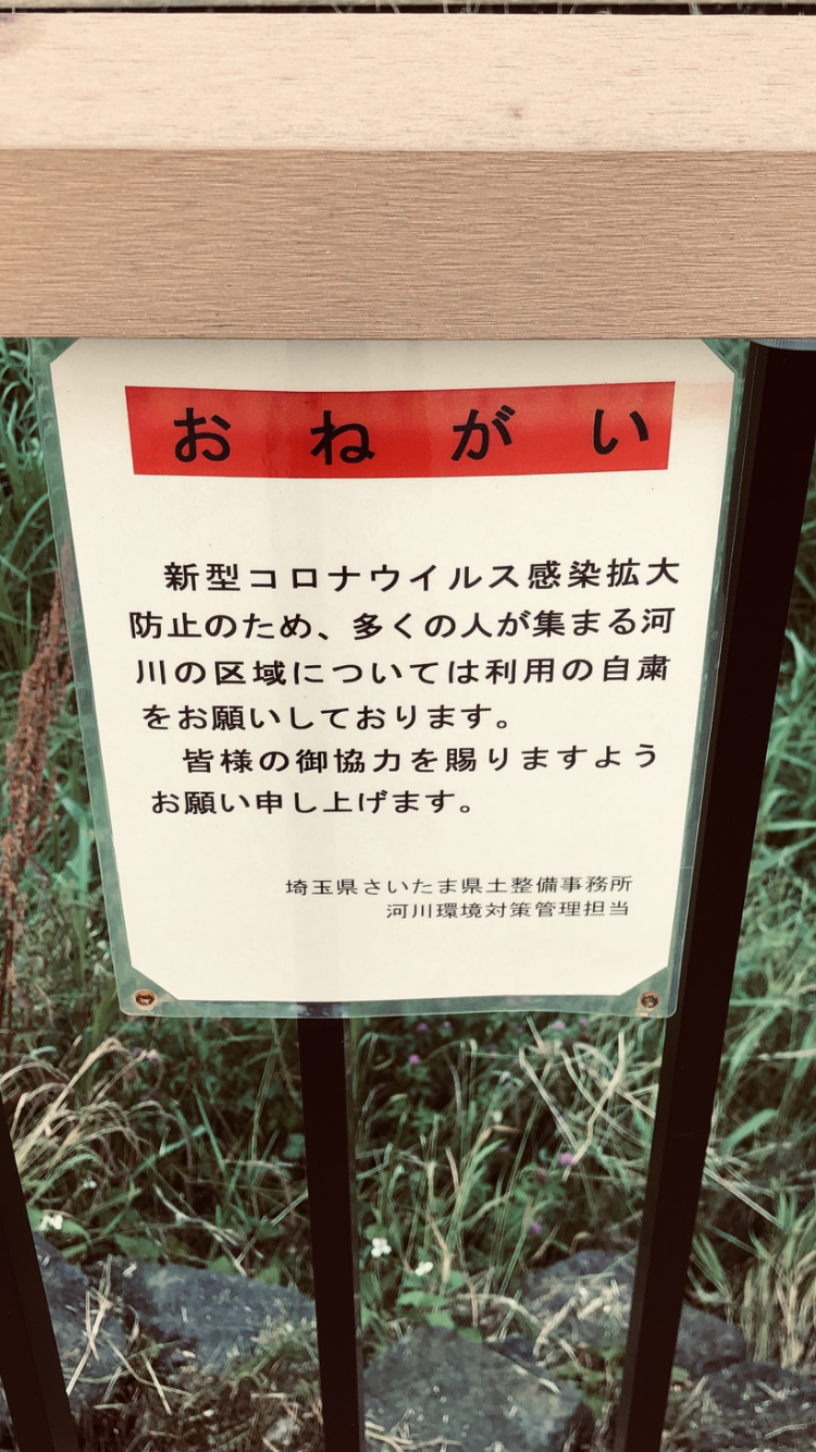 コロナの自粛の看板が通常の川沿いのお散歩コースにも貼られていました。