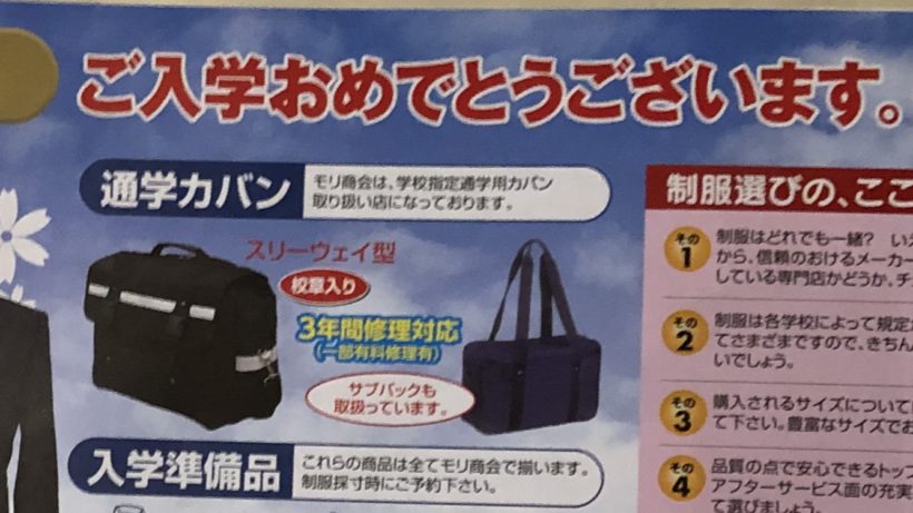 学校指定の学生服以外に通学カバンや通学シューズの購入案内もありました。