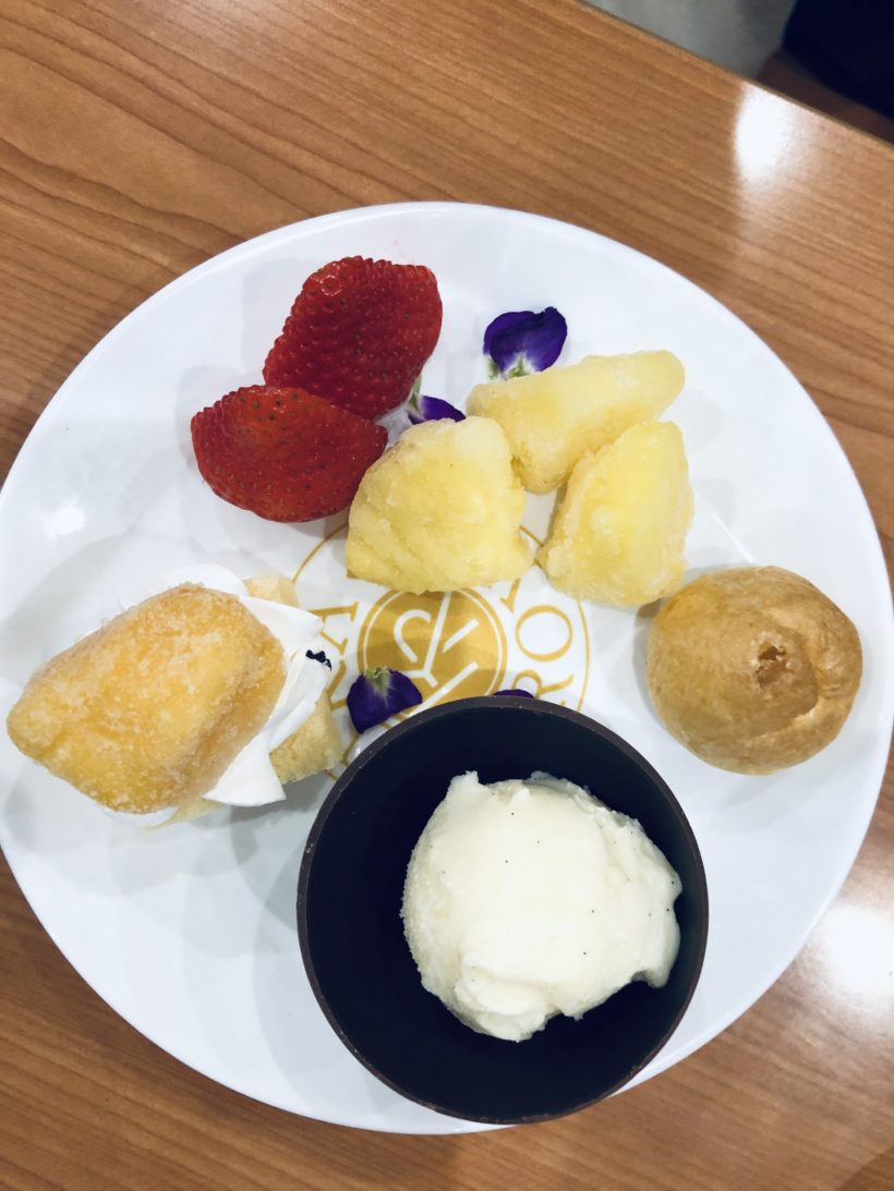 丸いチョコに一緒についてきた熱いいちごのソースをかけるとチョコが溶けて中からアイスが出てきました。